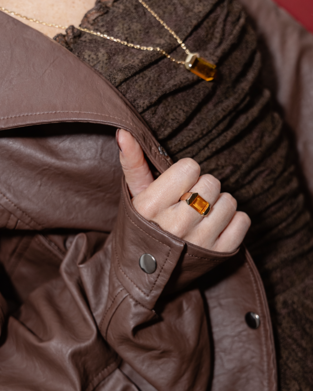 Anel com pedra central em tom amarelo vibrante e estrutura banhada a ouro. Um anel marcante que combina brilho e sofisticação em uma peça única.