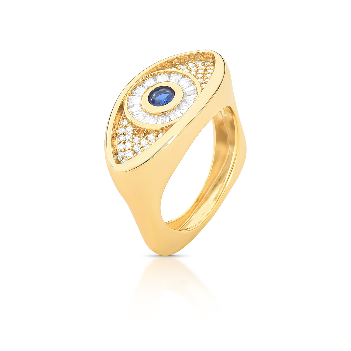 Anel com design inspirado no olho grego, símbolo de proteção e boas energias, com pedra central azul e aplicação de zircônias. Uma peça marcante que une significado e sofisticação em um visual moderno.