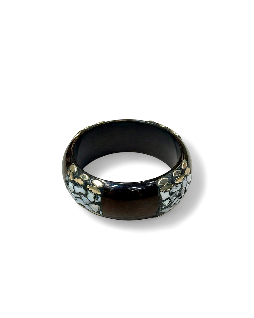 Um clássico com textura e brilho na medida certa. O Bracelete Médio Mosaico Marrom traz um corpo robusto em resina escura com acabamento polido e detalhes centrais em mosaico de madrepérola. A composição manual das pequenas peças cria um efeito iridescente e orgânico que reflete a luz de forma única. Uma peça que conversa com a estética artesanal sofisticada, ideal para quem busca elegância com presença.