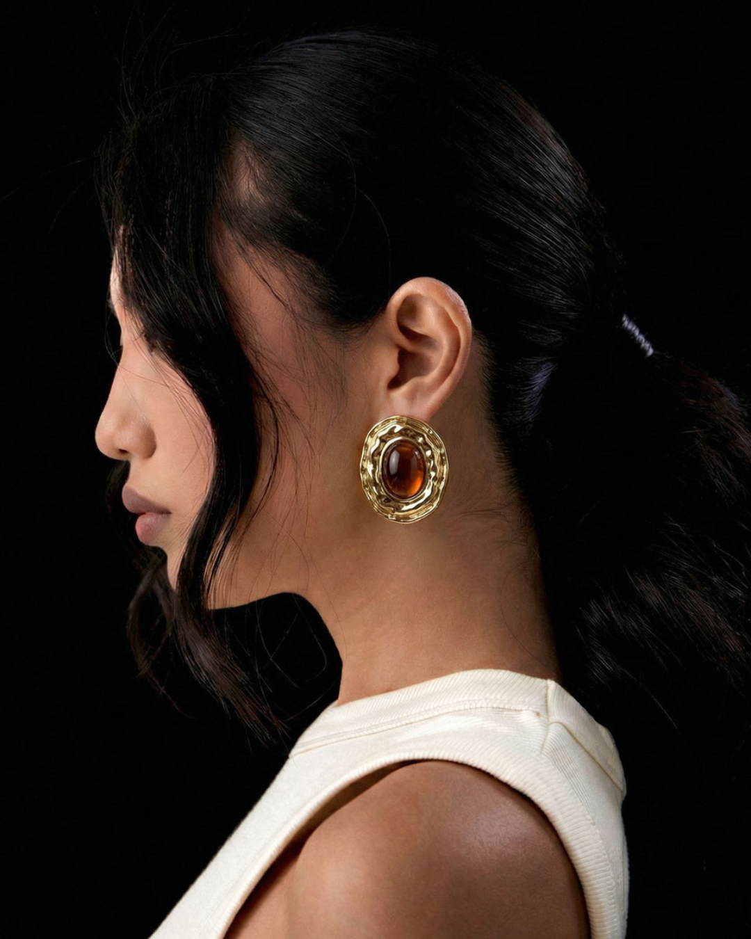 Brinco com pedra central em tom âmbar e base com textura orgânica banhada a ouro, criando um visual sofisticado e marcante. Uma peça elegante que mistura elementos naturais com um design contemporâneo.