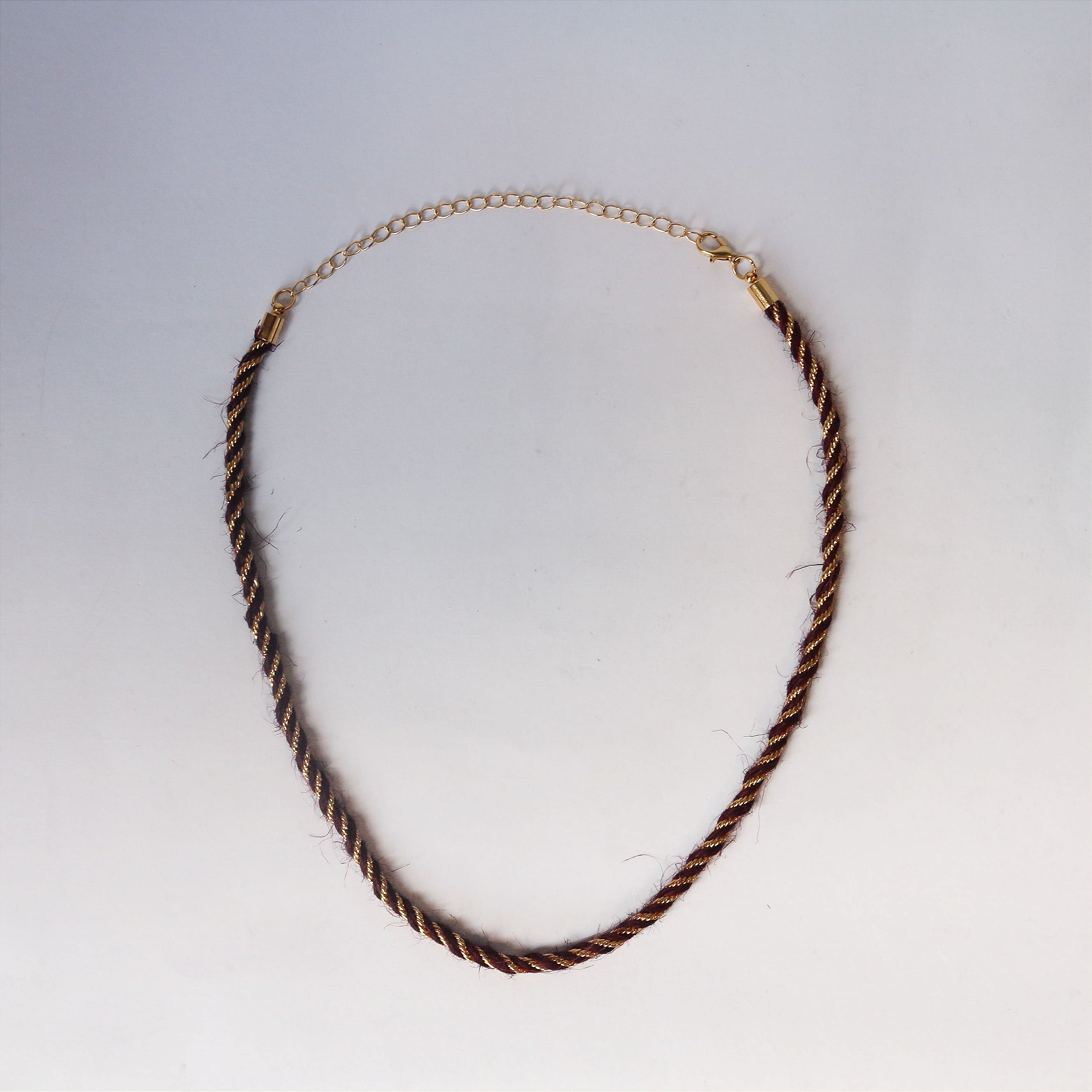 O sisal em bordô profundo cria uma moldura intensa para a corrente dourada que se entrelaça à trama natural. A cor traz um peso visual sofisticado e atemporal, que remete à tapeçarias antigas e tecidos nobres, enquanto o dourado confere frescor e luz. Esse colar é uma peça-arte que carrega força, textura e elegância orgânica.