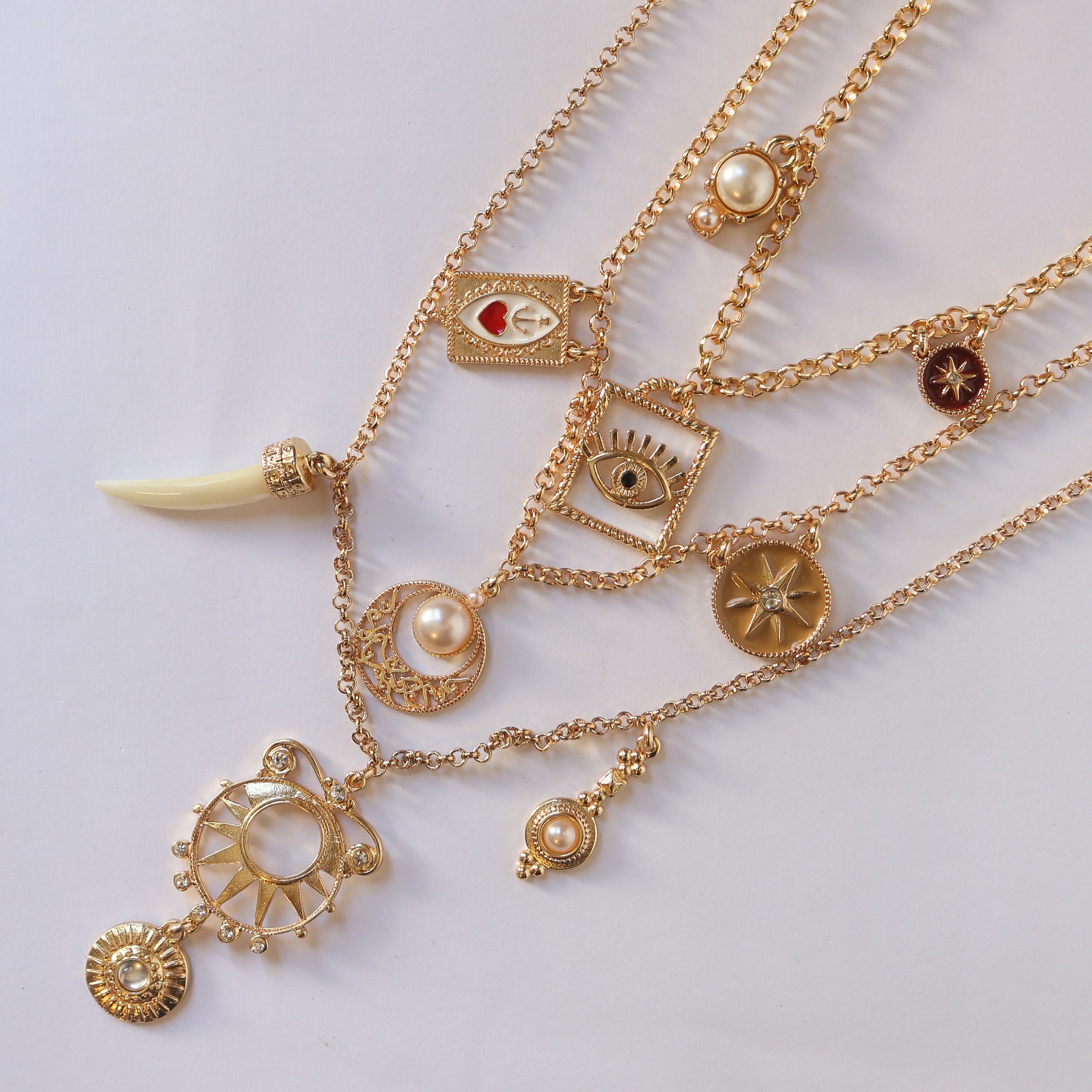 Esse colar dourado em três camadas traz equilíbrio entre o simbólico e o sofisticado. As correntes em alturas variadas criam um efeito dinâmico e elegante, onde cada nível revela uma sequência de pequenos pingentes — molduras com olhos, corações, arabescos ornamentais e um dente de tigre estilizado. Todos os elementos têm um ar místico e quase esotérico, mas apresentados de forma leve, refinada e contemporânea.
