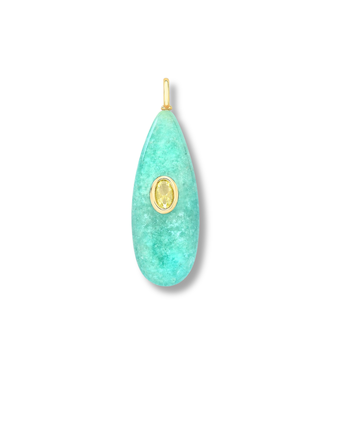 Pingente em formato alongado com pedra Amazonita de visual suave e sofisticado, combinado com cristal central que traz brilho e um toque de elegância à peça.